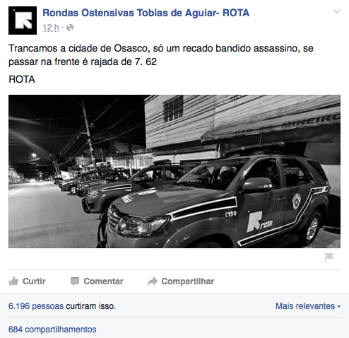 Ainda na noite desta quinta, uma página intitulada Rondas Ostensivas Tobias Aguiar (ROTA) postou uma foto de carros da tropa enfileirados dizendo: “Trancamos a cidade de Osasco, só um recado bandido assassino, se passar na frente é rajada de 7.62”.